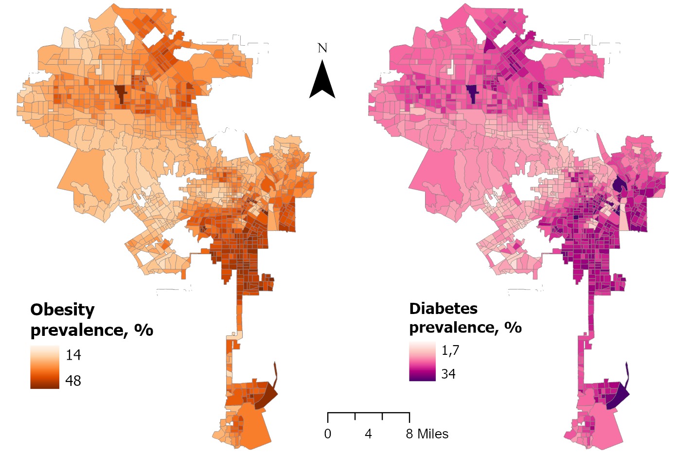2. City of Los Angeles, Prevalence of Obesity and Diabetes among adults (≥18 years) across census tracts (Data source: CDC PLACES project 2022)