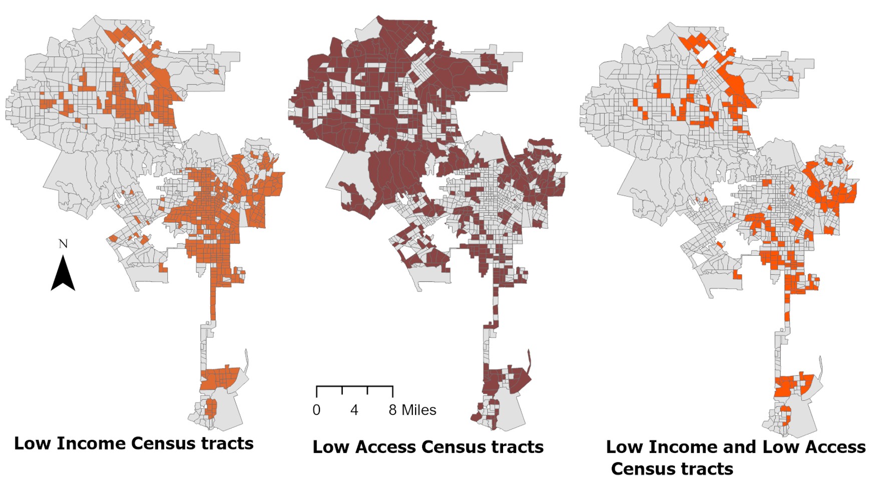 1. City of Los Angeles, census tracts/ neighborhoods with low-quality food environments (Data source: USDA Food Access Research Atlas 2021) ↩︎